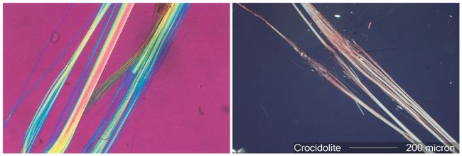 角閃石類礦物石棉(左鐵石棉Amosite,右青石棉Crocidolite)