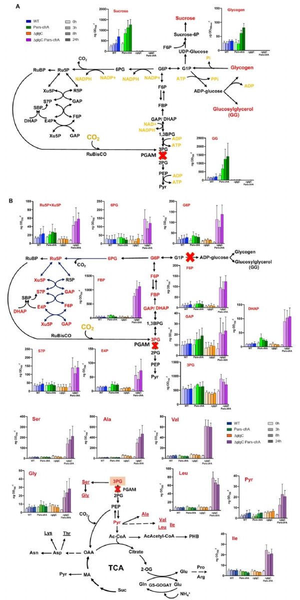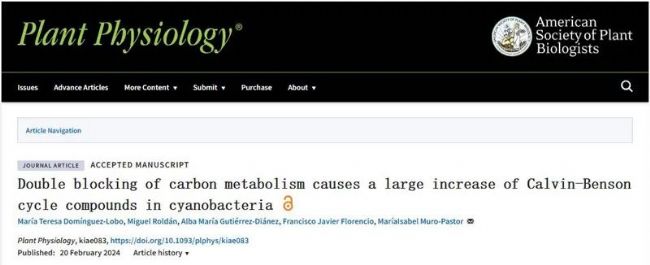 2024年2月20日,Plant Physiology雜志在線發(fā)表西班牙塞維利亞大學(xué)植物生物質(zhì)能與光能研究所MaríaIsabel Muro-Pastor實(shí)驗(yàn)室題為Double blocking of carbon metabolism causes a large increase of Calvin-Benson cycle compounds in cyanobacteria的研究論文。在本研究中,研究人員考慮到cfrA過表達(dá)的主要后果是糖原積累,研究了合成這種聚合物能力受損的Synechocystis sp.。María Teresa Domínguez-Lobo等人對野生型菌株和不能合成糖原的ADP-葡萄糖焦磷酸化酶突變體(ΔglgC)中的cfrA表達(dá)進(jìn)行了表型比較分析。在野生型背景下,CfrA的積累會導(dǎo)致光合作用的重新調(diào)整,但不會影響生長。然而,在ΔglgC 菌株中,生長會隨著CfrA的積累而降低,光合作用也會受到嚴(yán)重影響。對細(xì)胞中的H、C和N含量進(jìn)行的元素分析表明,野生型中cfrA的表達(dá)會導(dǎo)致C/N比值升高,這是由于氮同化減少所致。代謝組學(xué)研究表明,除了之前描述的糖原積累外,這些細(xì)胞還儲存了蔗糖和糖基甘油。然而,隨著cfrA的表達(dá),缺乏糖原合成能力的細(xì)胞積累了大量卡爾文-本森循環(huán)中間產(chǎn)物。這些細(xì)胞中某些氨基酸的含量也有所增加,主要是丙氨酸、絲氨酸、纈氨酸、異亮氨酸和亮氨酸。研究結(jié)果表明,通過在不同條件和菌株中控制cfrA 的表達(dá)可以改變固定碳的分布,從而帶來潛在的生物技術(shù)效益。本研究中,Synechocystis sp. PCC 6803葉綠素?zé)晒鉁y量由雙通道葉綠素?zé)晒鈨xDUAL-PAM-100完成。