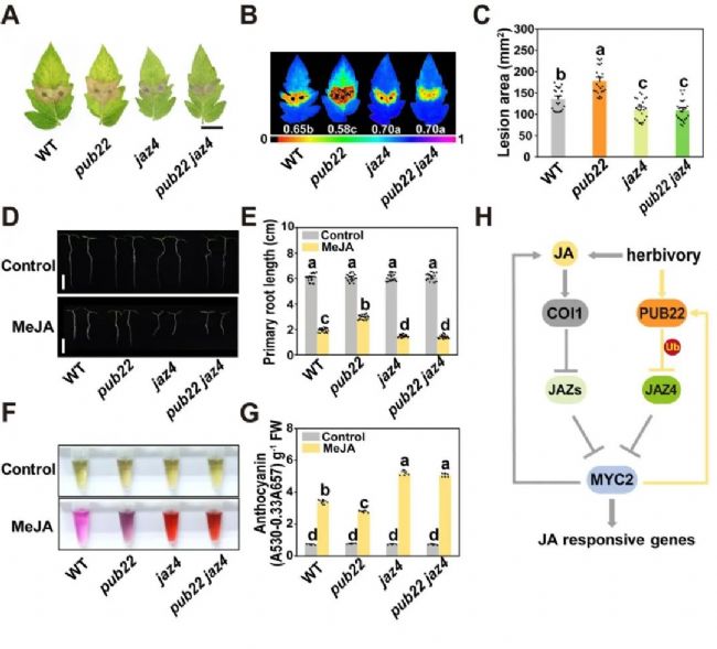 JA信號對于植物對壞死性病原體感染、冷凍和滲透脅迫的響應(yīng)以及各種發(fā)育過程(如花青素積累、初生根發(fā)育、毛狀體形成和雄性繁殖力)也是必不可少的。為了進(jìn)一步研究PUB22-JAZ4模塊在多種JA響應(yīng)過程中的作用,作者檢測了pub22、jaz4及pub22 jaz4突變體的灰霉病抗性、MeJA處理后的初生根長及花青素含量。結(jié)果顯示,PUB22的缺失增加了植物對灰霉病的易感性,減弱了JA誘導(dǎo)的初生根長抑制及花青素積累,而這些JA響應(yīng)在很大程度上被JAZ4的突變所緩解,表明PUB22-JAZ4廣泛參與多種JA響應(yīng)過程(下圖A-G)。其中圖B,脅迫對光合生理的影響通過IMAGING-PAM葉綠素?zé)晒獬上裣到y(tǒng)測量。
