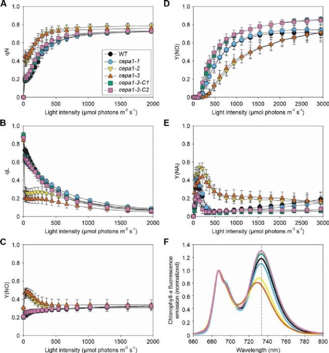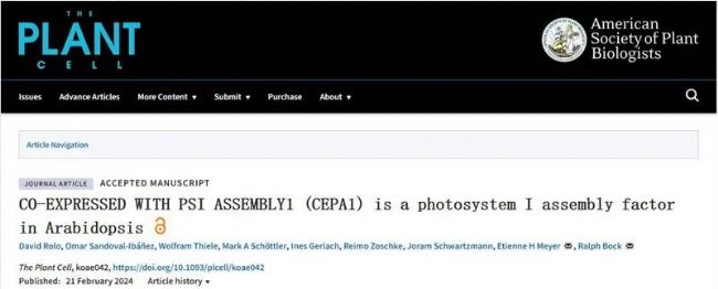 2024年2月21日,Plant Cell(IF.11.6)雜志在線發(fā)表德國馬普分子植物生理研究所Ralph Bock實(shí)驗(yàn)室標(biāo)題為CO-EXPRESSED WITH PSI ASSEMBLY1 (CEPA1) is a photosystem I assembly factor in Arabidopsis的研究論文。文章報(bào)告并描述了擬南芥中的PSI組裝因子CO-EXPRESSED WITH PSI ASSEMBLY1(CEPA1)。經(jīng)生物信息學(xué)鑒定,CEPA1基因與已知的PSI組裝因子共同表達(dá)。CEPA1基因的缺失會導(dǎo)致植物表型蒼白和發(fā)育遲緩,但不會完全喪失光自養(yǎng)能力。生物物理和生物化學(xué)分析表明,這種表型是由PSI積累的特定缺陷引起的。研究人員還發(fā)現(xiàn),CEPA1在翻譯后水平發(fā)揮作用,并與PSI共同定位在非垛疊的類囊體膜上。在活性凝膠電泳中,CEPA1與包括假定的PSI組裝中間體在內(nèi)的類囊體蛋白復(fù)合物共同遷移。最后,蛋白質(zhì)相互作用分析表明,CEPA1與PSI組裝因子PHOTOSYSTEM I ASSEMBLY3 PSA3相互合作?傊,本研究的數(shù)據(jù)支持CEPA1在PSI組裝中發(fā)揮重要但非必要的作用。本研究中,擬南芥光合活性相關(guān)的葉綠素?zé)晒鈪?shù)通過IMAGING-PAM葉綠素?zé)晒獬上裣到y(tǒng)和雙通道葉綠素?zé)晒鈨xDUAL-PAM-100測量。