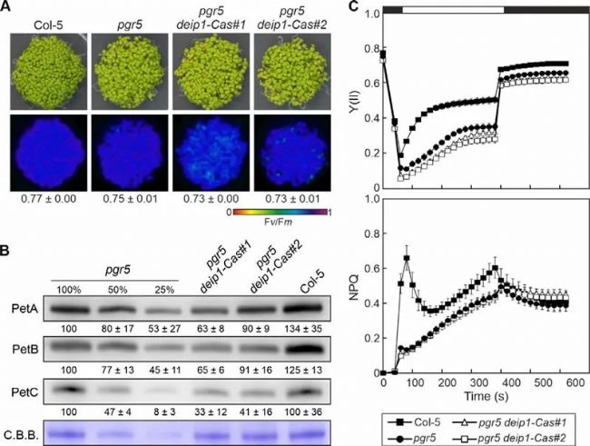(A)在MS板上長(zhǎng)時(shí)間培養(yǎng)4 d的WT (Col-5)、單(pgr5)和雙(pgr5 deip1- cas# 1和pgr5 deip1- cas# 2)突變體植株。下面是假彩色圖像,根據(jù)面板底部的色階顯示了每條植株線的Fv/Fm值。對(duì)于每條線,顯示值(n=3)±標(biāo)準(zhǔn)差(SD)的平均值。(B)從(A)中的幼苗中分離出等量的葉片總蛋白(調(diào)整為等于新鮮重量),在還原條件下通過(guò)SDS-PAGE分離,轉(zhuǎn)移到PVDF膜上,并用PetA-,PetB-或petc特異性抗體進(jìn)行免疫修飾。考馬斯亮藍(lán)(c.b.b)染色作為上樣對(duì)照。給出了三個(gè)實(shí)驗(yàn)的代表性印跡,以及波段定量(n=3)相對(duì)于pgr5(100%)±SD的平均值。(C)在100 μmol m−2 s−1的光化光作用下,使用HEXAGON-IMAGING-PAM熒光成像系統(tǒng)對(duì)(A)中暗適應(yīng)幼苗的誘導(dǎo)恢復(fù)曲線(如上圖白色和黑色條所示)的PSII量子產(chǎn)率(Y(II))和非光化學(xué)猝滅(NPQ)。顯示至少3次重復(fù)的平均值±SD。