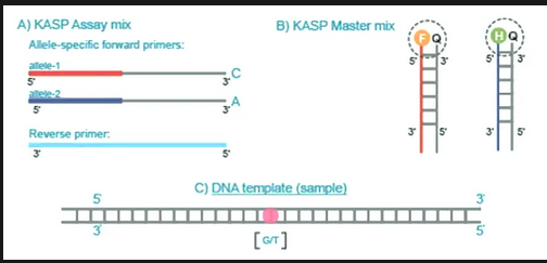 KASP (kompetitive allele specific PCR,競(jìng)爭(zhēng)性等位基因特異性聚合酶鏈?zhǔn)椒磻?yīng)) 是一種基于單核苷酸多態(tài)性(SNP) 的新型基因分型技術(shù)。該技術(shù)基于PCR 反應(yīng)結(jié)束后的熒光讀取,每孔采用雙色熒光檢測(cè)一個(gè)樣本一個(gè)位點(diǎn)可能的兩種基因型,是目前最為高效和經(jīng)濟(jì)的基因分型手段之一。下面我們來(lái)看看如何通過(guò)盤(pán)古qPCR儀進(jìn)行KASP基因分型檢測(cè)。