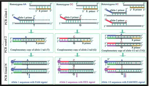 通過(guò)qPCR儀進(jìn)行PCR擴(kuò)增。在第一輪PCR擴(kuò)增中,等位基因特異引物(3'末端能配對(duì)的)就可識(shí)別特定等位基因模板,完成等位基因識(shí)別,反向通用引物也會(huì)結(jié)合并完成整個(gè)PCR過(guò)程,在此階段,熒光標(biāo)記的探針仍與其互補(bǔ)的淬滅探針結(jié)合,并且不會(huì)產(chǎn)生熒光信號(hào)。從第二輪PCR擴(kuò)增開(kāi)始,產(chǎn)物中出現(xiàn)攜帶通用標(biāo)簽序列(tag sequence)的模板,這步完成把通用標(biāo)簽序列引入與SNP對(duì)應(yīng)的PCR產(chǎn)物中。隨后攜帶熒光的探針通過(guò)與tag互補(bǔ)的DNA鏈結(jié)合而添加到PCR產(chǎn)物中,因此不再與其互補(bǔ)的淬滅探針結(jié)合,從而產(chǎn)生熒光信號(hào)。