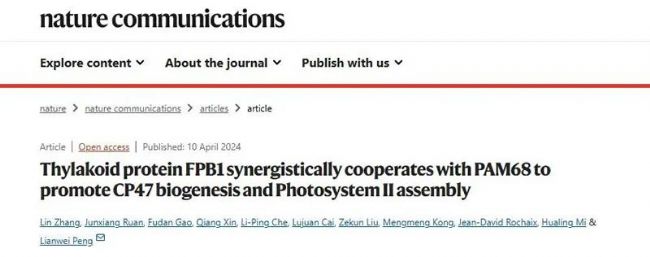 上海師范大學(xué)生命科學(xué)學(xué)院植物種質(zhì)資源開(kāi)發(fā)中心的張琳副研究員,阮俊祥博士為論文的共同一作,彭連偉教授為論文的通訊作者。本研究得到了上海市自然科學(xué)基金和上海市植物種質(zhì)資源工程研究中心的支持。Zhang, L., Ruan, J., Gao, F., et al. Thylakoid protein FPB1 synergistically cooperates with PAM68 to promote CP47 biogenesis and Photosystem II assembly[J]. Nature Communications, 15, 3122 (2024).