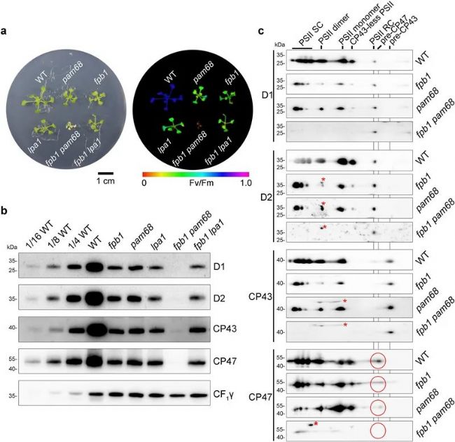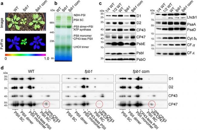 研究人員通過(guò)遺傳和生化實(shí)驗(yàn)發(fā)現(xiàn),F(xiàn)PB1與已知的PAM68蛋白協(xié)同作用,共同促進(jìn)了CP47—PSII核心亞基的生物合成。在缺乏FPB1和PAM68的情況下,CP47的合成速率降低,且無(wú)法形成功能性的PSII復(fù)合體,導(dǎo)致植物無(wú)法進(jìn)行有效的光合作用。