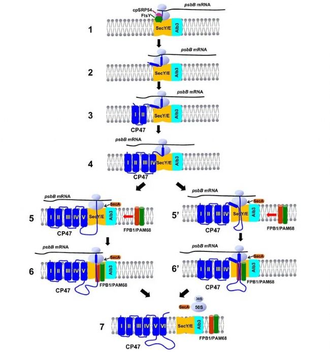 ◆ 葉綠體中CP47的共翻譯組裝以及FPB1和PAM68功能的可能模型