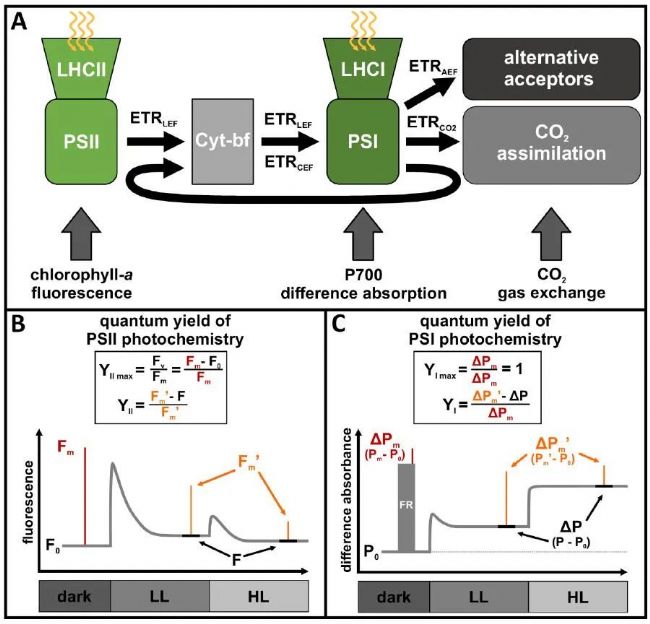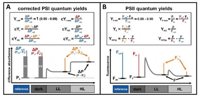 最大YI值恒定的假設(shè)不可避免地會導致PSI量子產(chǎn)率的定義不考慮PSI光抑制作用,這相當令人吃驚,因為PSI光抑制作用被廣泛認為與最大氧化還原活性PSI分數(shù)或ΔPm的降低一致。忽略PSI光抑制作用會導致PSI量子產(chǎn)率失真,以前曾將其描述為PSI的“漏斗效應(yīng)”。如果不考慮這種現(xiàn)象,就會嚴重限制我們對PSI的調(diào)控能力以及PSI和PSII產(chǎn)量之間關(guān)系的研究,尤其是在無法事先排除PSI光抑制的條件下,例如在越冬北方針葉樹中。