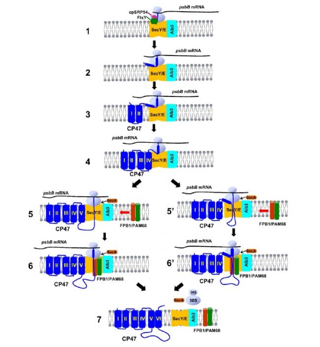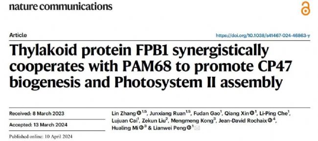 光合作用是植物生長和生存的關(guān)鍵過程,而光系統(tǒng)II(PSII)是這一過程的核心。光系統(tǒng)II(PSII)復合體在光合生物中起著至關(guān)重要的作用,它催化水分子向質(zhì)體醌的電子轉(zhuǎn)移,從而激發(fā)光合作用過程中的電子傳遞。PSII的組裝是一個復雜的過程,首先形成D2-Cyt b559亞復合體,作為D1和PsbI的受體復合體。D1的前體(pD1)在翻譯過程中與D2-Cyt b559亞復合體共翻譯整合,形成PSII反應(yīng)中心。PSII反應(yīng)中心蛋白D1含有五個TMDs,其共翻譯插入過程已得到深入研究。在D1的第一個TMD從核糖體通道中出現(xiàn)之前,核糖體通過與核糖體蛋白L420的相互作用與cpSRP54結(jié)合,然后D1的核糖體新生鏈(RNC)通過SRP受體cpFtsY被引導到類囊體膜中的SecY/E轉(zhuǎn)位子。盡管PSII核心亞基D2、CP43和CP47被認為可能是共翻譯組裝的,但目前尚不清楚SecY/E-cpSRP54靶向機制是否參與它們的翻譯和組裝,以及這些亞基的跨膜結(jié)構(gòu)域如何通過分子伴侶調(diào)節(jié)整合到膜中。2024年4月10日,Nature Communications在線發(fā)表上海師范大學彭連偉教授實驗室題為Thylakoid protein FPB1 synergistically cooperates with PAM68 to promote CP47 biogenesis and Photosystem II assembly的研究論文,文章揭示了一個新的蛋白質(zhì)FPB1(Facilitator of PsbB biogenesis1),它在PSII的組裝中扮演著重要角色,它是PSII積累所必需的。