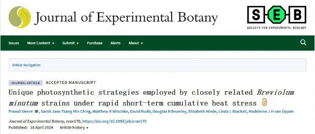 共生藻類是珊瑚和?纫幌盗写贪麆游锼拗鞯陌麅(nèi)共生微藻,提供光合固碳以換取宿主提供的氮。這些藻類對脅迫的耐受水平對其宿主的生存至關(guān)重要,尤其是在夏季熱浪期間,熱浪往往會導致共生藻與珊瑚宿主之間的生物群落失調(diào),造成白化現(xiàn)象。例如,Durusdinium屬中的物種通常比Cladocopium屬中的物種賦予宿主更高的白化耐受性,Cladocopium C15輻射中不同成員的存在與珊瑚不同的熱耐受性有關(guān)。共生藻類植物的耐熱性取決于它們在熱脅迫下保持光合系統(tǒng)II的最大光合產(chǎn)物率(Fv/Fm of PSII)和高水平碳固定的能力。2024年4月18日,Journal of Experimental Botany雜志在在線發(fā)表墨爾本大學生物科學學院為署名單位,標題為Unique photosynthetic strategies employed by closely related Breviolum minutum strains under rapid short-term cumulative heat stress的研究論文。