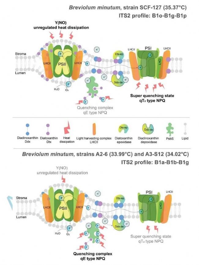 該研究文章的核心內(nèi)容是關(guān)于三種密切相關(guān)的Breviolum minutum藻株在快速短期累積熱應(yīng)激(26-40°C)下所采用的獨特光合作用策略。研究比較了這些藻株的熱耐受性、光化學和非光化學淬滅、光合色素的脫環(huán)氧化狀態(tài)以及活性氧物質(zhì)(ROS)的積累。主要發(fā)現(xiàn)和結(jié)論包括:不同的B. minutum藻株采用了不同的光保護策略,導致了它們各自的上部熱耐受性不同。研究提供了之前未知的熱耐受性特征和光保護機制之間的相互依賴性,包括激發(fā)能量及其通過非光合猝滅的快速放松和狀態(tài)轉(zhuǎn)換組分的耗散之間的微妙平衡。更具熱耐受性的B. minutum藻株(B1-B1o-B1g-B1p)表現(xiàn)出增強的脫環(huán)氧化作用,與類囊體膜的熔點強烈相關(guān),并可能通過膜加固將氧化損傷最小化。該研究深入理解了在密切相關(guān)的B. minutum藻株中支撐熱耐受性的光保護機制。研究還探討了在熱應(yīng)激下,不同B. minutum藻株的光合作用參數(shù)變化,包括光系統(tǒng)II的最大光合效率(Fv/Fm)、實際量子產(chǎn)量(ΔF/Fm′)、非光化學淬滅(NPQ)以及ROS的產(chǎn)生。通過主成分分析(PCA)和不同的統(tǒng)計測試,研究揭示了不同藻株在熱應(yīng)激下的光生理響應(yīng)差異。文章還討論了在熱應(yīng)激下,B. minutum藻株的光保護機制的動態(tài)變化,包括快速放松的NPQ(qE型)、慢放松的NPQ(qI型)、以及狀態(tài)轉(zhuǎn)換(qT1和qT2型)。該研究的結(jié)果與之前觀察到的它們的宿主Exaiptasia diaphana的熱漂白耐受性一致,強調(diào)了在面對快速短期熱應(yīng)激時,不同藻株采取了不同的光合作用策略。