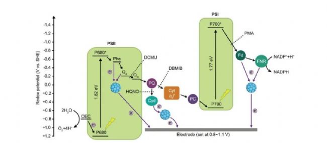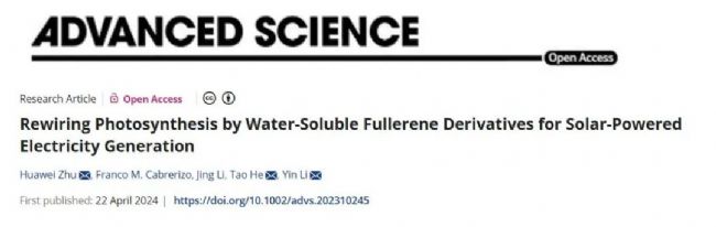 光合作用將光能轉(zhuǎn)變?yōu)榛瘜W能是自然界中最重要的能量轉(zhuǎn)化過程。光反應(yīng)通過光氧化裂解水,產(chǎn)生大量高能態(tài)電子,經(jīng)光合電子傳遞鏈生成還原力NADPH和ATP,用于暗反應(yīng)生物固碳反應(yīng)。利用生物元件或人工元件改變光合電子傳遞方向,有望提高生物光電轉(zhuǎn)化效率,用于生物光伏、光驅(qū)生物制造、光合產(chǎn)氫等系統(tǒng)。然而,天然光合系統(tǒng)和細胞代謝調(diào)控非常復雜,傳統(tǒng)生物工程策略難以實現(xiàn)光合電子傳遞過程的改造和調(diào)控。2024年4月22日,中國科學院微生物研究所李寅團隊的朱華偉博士與國家納米科學中心賀濤研究員合作,在Advanced Science雜志上發(fā)表題為Rewiring photosynthesis by water-soluble fullerene derivatives for solar-powered electricity generation的研究論文。文章提出了一種改變光合電子傳遞方向的新策略,即利用零維碳納米材料從光合電子傳遞鏈中截流電子并傳遞到胞外,從而提高生物光電轉(zhuǎn)化效率。研究人員設(shè)計合成了一種表面帶正電荷的水溶性富勒烯納米材料,該納米材料被藍藻細胞捕獲后,可以改變光合電子傳遞方向,促進光合電子向胞外分流,將光電流密度提高一個數(shù)量級。