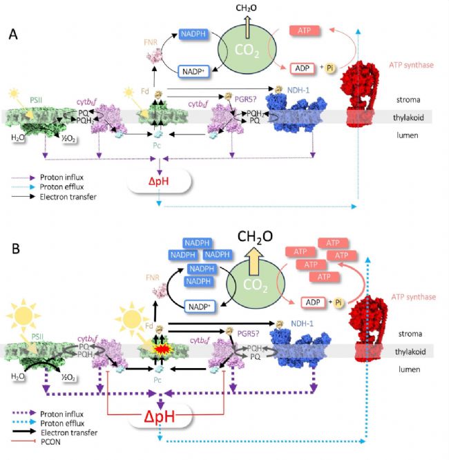 光合生物可以吸收和利用光能,但是不能儲存光能,因此它們必須謹慎地平衡這些代謝物的生成和消耗。如果光反應(yīng)和CBB循環(huán)的速率不匹配,光照過強時會形成活性氧(ROS)導致細胞損傷,光照受限時則會導致細胞性能下降和生長受限。調(diào)節(jié)光反應(yīng)的一個重要機制是光合控制(PCON),它在NADPH和ATP的生成超過CO2固定需求的條件下,通過維持高ΔpH對電子-質(zhì)子轉(zhuǎn)移反應(yīng)進行反饋調(diào)節(jié)。PCON通過調(diào)節(jié)電子傳遞速率,保護光系統(tǒng)I(PSI)免受光誘導損害。在波動光照環(huán)境中進行的實驗證明,PCON是植物生長和恢復能力的必要條件,缺乏該過程的突變體會遭受PSI的嚴重破壞。
