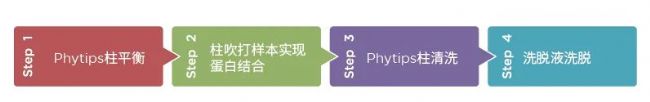 PhyTip為槍頭式分散固相親和色譜柱,采用槍頭式裝置,純化樹(shù)脂被填充于槍頭尖端,由自動(dòng)化液體處理工作站加載PhyTip,可以實(shí)現(xiàn)單通道到96通道靈活樣品數(shù)純化,其純化流程如圖7所示,可對(duì)微克級(jí)到毫克級(jí)的蛋白進(jìn)行純化。