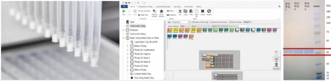 Biomek液體工作站與槍頭式純化色譜柱相結(jié)合,利用工作站加載PhyTip讓純化流程變得如移液流程一樣簡(jiǎn)單!如圖8所示,加樣器加載PhyTip,分別在平衡液、蛋白樣品、洗雜液和洗脫液中混勻即可完成高通量蛋白純化,單次可處理96個(gè)樣品,收集10mL菌液使用PhyTip(40uL填料),純化后經(jīng)BCA蛋白定量測(cè)定蛋白含量穩(wěn)定在400ug左右,優(yōu)于手工對(duì)照實(shí)驗(yàn)340ug的結(jié)果,96孔板操作時(shí)間約為90min。