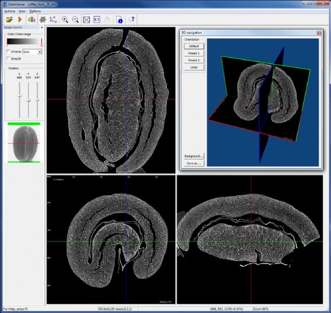 咖啡豆的三個(gè)正交虛擬切片,由以 8 微米各向同性分辨率運(yùn)行的微型 CT 系統(tǒng)無損重建。
