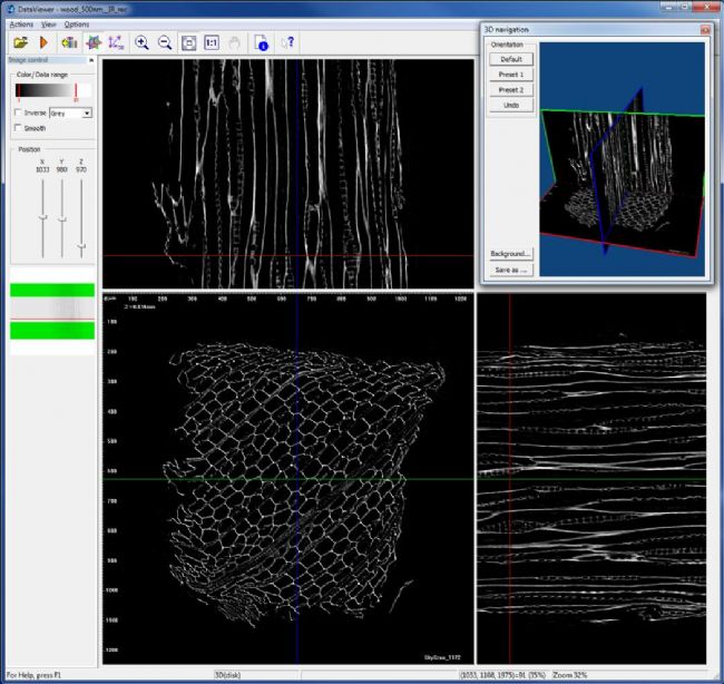 三個(gè)正交虛擬切片顯示木材樣品中的單個(gè)細(xì)胞,通過具有 500 納米各向同性分辨率的微 CT 系統(tǒng)對樣品進(jìn)行了無損可視化檢測。