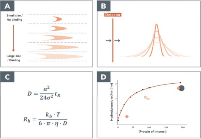 FIDA,(Flow Induced Dispersion Analysis) 即流體誘導(dǎo)分散分析,基于毛細管中層流運動的分析方法,當樣品通過毛細管時,由于毛細管中心和毛細管壁之間速度不同,毛細管中心速度快,毛細管邊緣速度慢,樣品流動呈拋物線剖面。不同的拋物線剖面(圖1.A)決定了信號曲線的形狀(圖1.B),結(jié)合斯托克愛因斯坦方程和泰勒分散公式,以此實現(xiàn)對分子粒徑(size,流體力學(xué)半徑Rh)“第一性原理(first principle)”測量。FIDA的流體動力學(xué)半徑測量廣泛適用于生物分子穩(wěn)定性、構(gòu)象變化、相互作用等方面的研究。