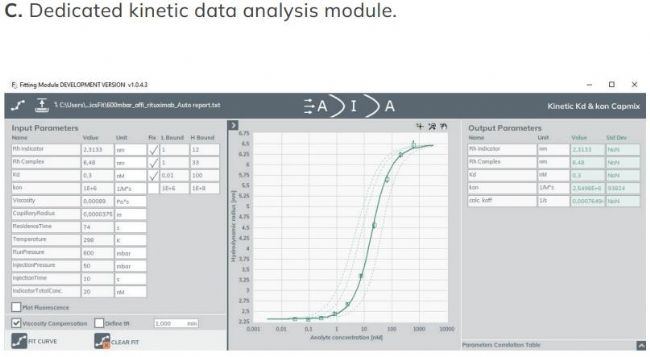 除了結(jié)合動力學(xué)(Kon和Koff)之外,F(xiàn)IDA還可測量平衡結(jié)合常數(shù)(KD)和流體動力學(xué)半徑(Rh)。使用FIDA方法獲得的數(shù)據(jù)與SPR非常吻合。