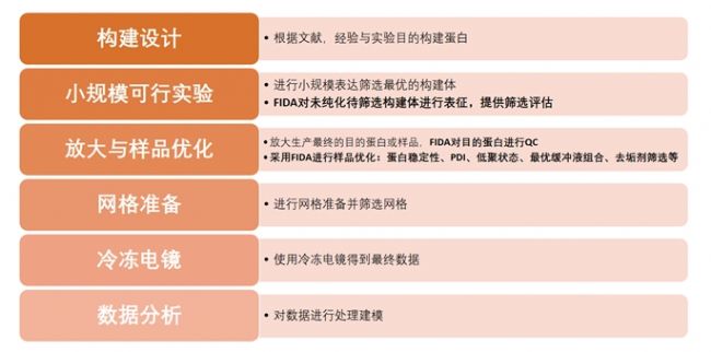 FIG1.FIDA的冷凍電鏡解決方案,從小規(guī)模構(gòu)建,放大生產(chǎn)質(zhì)控與樣品優(yōu)化全流程都大部分工作可直接通過(guò)FIDA完成,尤其是無(wú)稀釋的樣品優(yōu)化,可大大提高得到高質(zhì)量冷凍電鏡數(shù)據(jù)成功率。