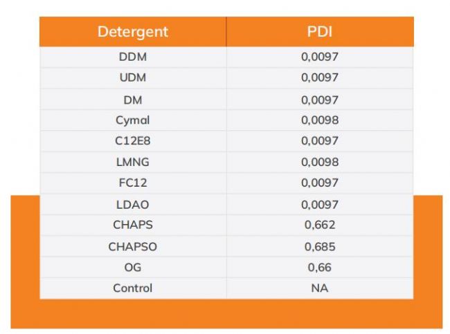 FIG3.用40nL的GFP標(biāo)記的Lac-Y蛋白座位指示劑,采用11種不同去垢劑方案對(duì)蛋白溶解程度和PDI指數(shù)檢測(cè)