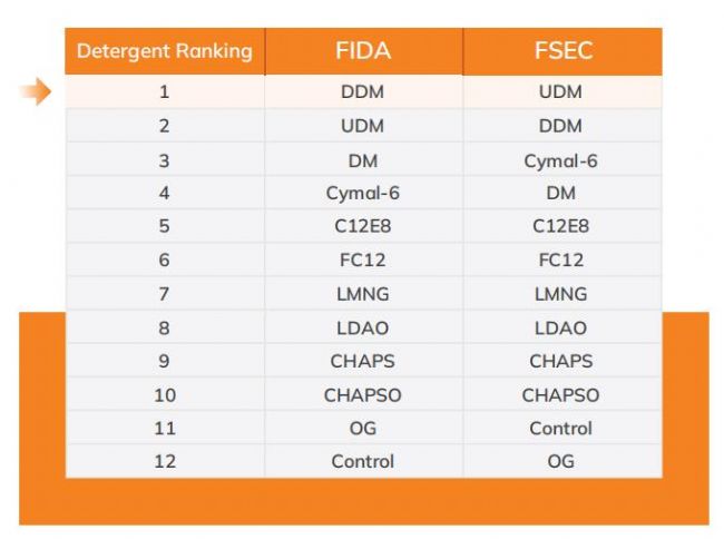 FIDA再根據(jù)峰值的形狀計(jì)算了了不同去垢劑中蛋白的多分散指數(shù)(PDI),可確定樣品是否在去垢劑中呈單分散狀態(tài),這是評(píng)估樣品是否適合高質(zhì)量單粒子冷凍電鏡的關(guān)鍵指標(biāo)。最后綜合樣品在去垢劑中的溶解度和PDI進(jìn)行對(duì)不同組合排序可以得到最優(yōu)的組合,并且最終結(jié)果與FSEC方法一致。