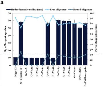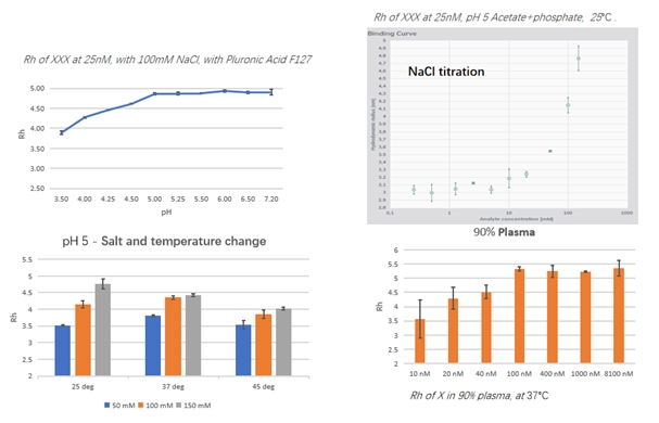 FIDA高通量評(píng)估在加入12種不同化合物緩沖液中預(yù)孵育后,aSOs-Alexa488樣品聚合和單體的Rh和比例,在復(fù)合體/聚集體樣品的制備和優(yōu)化中可評(píng)估緩沖液體系是否能維持樣本有活性的聚合狀態(tài)。