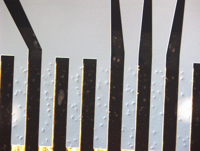 比如在液晶面板ACF層結構中有導電粒子,其填充情況對面板良率有極大影響,使用DIC照明可以看到導電粒子形成的微小凸起,從而快速評估工藝結果是否符合預期。此外液晶屏噴漆的漆體顆粒、液晶屏細微劃痕等瑕疵,也可以使用DIC觀察發(fā)現。