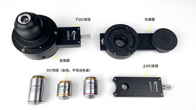 最初的DIC顯微鏡是由偏光顯微鏡改造而成的,因此偏光顯微鏡的一些核心配件也是DIC顯微鏡的核心配件,包括起偏器、檢偏器、無應力物鏡,以及DIC核心配件,帶滑動器DIC棱鏡。特殊配置可能還有de sénarmont補償器等配件,基本思路類似偏光顯微鏡的補償器,可以調整增強透明樣品效果,這里不作討論。