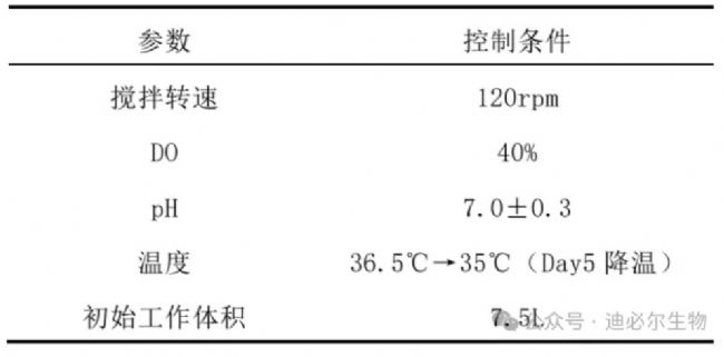 本次實(shí)驗(yàn)以7.5×105 cells/mL的細(xì)胞密度接種,pH、DO電極選擇浸入式?諝庖0.06 L/min(0.008 VVM)的通氣速率進(jìn)行恒通,DO由氧氣的通氣速率級(jí)聯(lián)控制,pH由二氧化碳(酸)通氣速率級(jí)聯(lián)控制。其他參數(shù)控制和補(bǔ)料控制見(jiàn)表1和表2。
