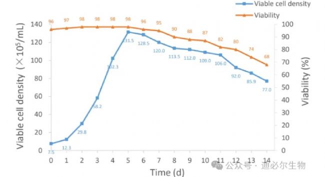 本次實(shí)驗(yàn)細(xì)胞前期快速生長(zhǎng),最高活細(xì)胞密度達(dá)1.32×107 cells/mL,細(xì)胞活率維持在95%~100%之間,在第14天結(jié)束培養(yǎng)(圖2)。
