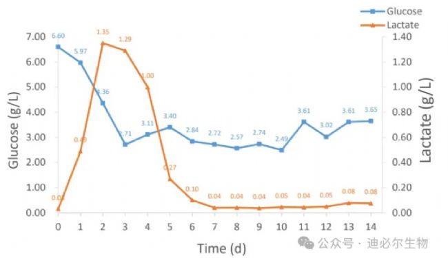 葡萄糖(Glucose)濃度保持在2.49 g/L以上,保證糖的供給;并且此次培養(yǎng)的乳酸(Lactate)濃度在前期最高達(dá)1.35 g/L,第三天開(kāi)始下降,第七天至實(shí)驗(yàn)結(jié)束乳酸維持在0.04 g/L~0.08 g/L(圖3)。