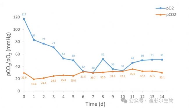 此次培養(yǎng)過(guò)程二氧化碳分壓(pCO2)在19.4 mmHg~35.9 mmHg之間波動(dòng)(圖4)。而pCO2如果低于臨界值下限25 mmHg,對(duì)細(xì)胞以及抗體表達(dá)存在一定影響[2]。