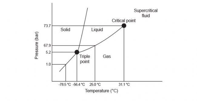 超臨界流體是流體壓力和溫度超過臨界值的產(chǎn)物。在臨界點(diǎn)處,氣液兩相間的界面消失,此時(shí)高度壓縮氣體的密度與液體密度相近。超臨界流體還具有類似于氣體的高擴(kuò)散性和低粘度。其溶解能力主要與密度相關(guān),而密度可通過控制壓力和溫度進(jìn)行調(diào)節(jié)。一般來說,密度越大溶解能力越強(qiáng),降低溫度或增大壓力均可增大密度。另一方面,升高溫度或減小壓力則會(huì)使密度變小。圖1所示為CO2的相圖,展示了它從一種狀態(tài)到另一種狀態(tài)的物理變化及其臨界點(diǎn)。