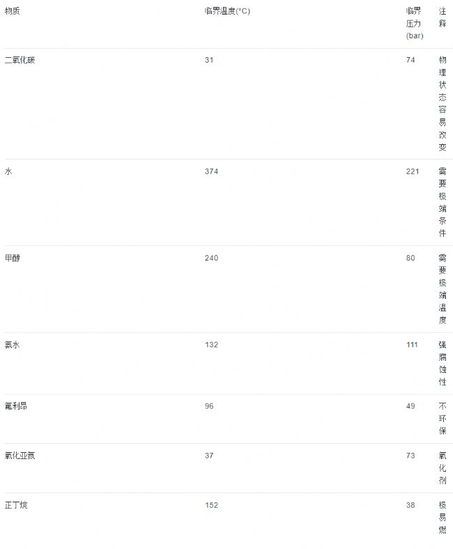 很多物質(zhì)在極端條件下才能轉(zhuǎn)變?yōu)槌R界狀態(tài),而且在該狀態(tài)下會(huì)表現(xiàn)出某些不良特性。表1所示為幾種物質(zhì)轉(zhuǎn)變?yōu)槌R界流體的條件及其在此狀態(tài)下的特性。不同于其他超臨界物質(zhì),CO2不可燃、無爆炸危險(xiǎn)、無毒性或腐蝕性,因此通常被認(rèn)為是一種十分安全的物質(zhì)。此外,CO2很容易達(dá)到超臨界狀態(tài)(在31 °C和74 bar下),因此人們能夠在可接受的溫度和壓力范圍內(nèi)控制其密度。不僅如此,由于臨界溫度相對(duì)溫和,它還適用于處理熱不穩(wěn)定樣品。CO2還易于通過其他工業(yè)工藝回收,因而價(jià)格相對(duì)低廉;這意味著它對(duì)環(huán)境CO2水平的影響是中性影響。上述所有優(yōu)勢(shì)使得CO2成為了超臨界流體技術(shù)最常用的物質(zhì)。