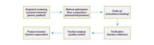超臨界流體色譜(SFC)是一種色譜技術(shù),其使用亞臨界(液態(tài))和超臨界CO2作為流動(dòng)相的主要溶劑,通常還需搭配有機(jī)溶劑使用。和所有色譜技術(shù)一樣,SFC技術(shù)也基于分析物在固定相(色譜柱)和流動(dòng)相(溶劑)之間的分配來分離各組分。HPLC與SFC有許多相似之處,例如:SFC可在等度和梯度方法條件下運(yùn)行,并且兼容所有標(biāo)準(zhǔn)檢測技術(shù),如紫外(UV)檢測、光電二極管陣列(PDA)檢測、蒸發(fā)光散射(ELS)檢測和質(zhì)譜(MS)檢測。常規(guī)Prep SFC工作流程與HPLC的相同,包括方法開發(fā)、放大、餾分收集,以及對(duì)收集到的餾分進(jìn)行純度分析(圖3)。SFC的回收率和樣品純度可媲美RPLC,在某些應(yīng)用中SFC的回收率較高,而對(duì)于其他應(yīng)用,HPLC是更好的解決方案。