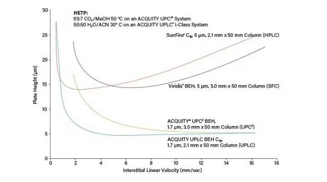 SFC效率的提升得益于流動(dòng)相的低粘度和高擴(kuò)散性對(duì)色譜分析速度和效率的提升。圖4比較了HPLC、UPLC、SFC和UPC2的Van Deemter曲線。在色譜分析中,分離速度部分取決于溶質(zhì)在流動(dòng)相中的擴(kuò)散速度及其進(jìn)出固定相的速度。SFC的Van Deemter曲線比HPLC更寬更平,這表示SFC在流速(線性流速)增大的情況下仍能保持較高的色譜效率(低塔板高度)。SFC的高擴(kuò)散系數(shù)直接轉(zhuǎn)化成了更快的色譜分析速度。