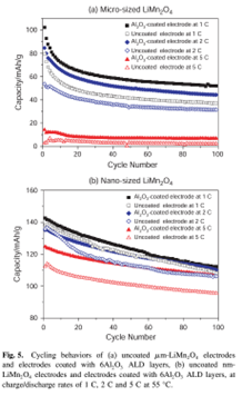 LiMn2O4(LMO)是一種低成本、高電壓的正極材料,但其電導(dǎo)率差和 Li+ 擴(kuò)散緩慢限制了其性能。Luan【3】等人的研究中,通過 ALD Al2O3 涂層改善了 LMO 在高溫下的性能。通過對兩種不同尺寸的錳酸鋰顆粒進(jìn)行包覆,在1C,2C,5C 的倍率下測試其高溫性能,發(fā)現(xiàn)均優(yōu)于未包覆的電極。