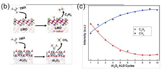 Chen【4】等通過實(shí)驗(yàn)表征和密度泛函理論(DFT)計(jì)算發(fā)現(xiàn),Al2O3 在 10 個(gè) ALD 循環(huán)下呈現(xiàn)亞單層覆蓋(不均勻生長)。在 ALD 過程中,LMO 與鋁前驅(qū)體表面反應(yīng)的產(chǎn)物 C2H6 氣體逐漸減少,表明在 ALD 循環(huán)過程中,LMO 表面可用位點(diǎn)越來越少。通過 1-2 次 ALD 循環(huán),LMO 表面缺陷趨于穩(wěn)定,從而提高了電化學(xué)性能。