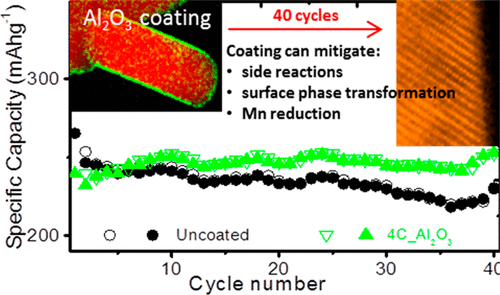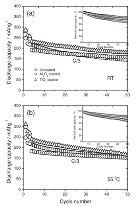 對于 LiMn2O4 基電池,氧化鋁包覆有助于減少 Mn 的溶解,同時(shí)提高電池在高溫下的性能。