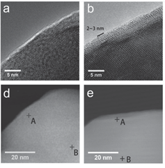 左:富鋰錳正極在 (a) 室溫下和 (b) 55°C。測試程序:循環(huán)1,在 2.0 和 4.8V 之間,C/10 倍率下激活;周期 2-3 為 2.0 ~ 4.6 V 之前,C/10;循環(huán) 4-50 在 2.0 和 4.6V 間,C/3 右:a,d(UC);c,d(PC)的TEM圖像