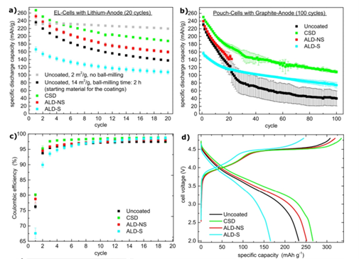 NMC 材料因其高容量和低成本而備受關(guān)注。Riley 等人【10】的研究展示了 ALD Al2O3 涂層在 NMC333 上的應(yīng)用,證明了涂層能顯著提高電池的容量保持率和循環(huán)穩(wěn)定性。與 UC 正極的 65% 的容量保持率相比,UC 正極的容量保持率提高到91%,并且即使在 100 次充放電循環(huán)后,保形涂層 Al2O3 厚度依然小至4 Å(2cycle ALD),體系電阻也有所降低,但進(jìn)一步增加 Al2O3 的厚度會降低電化學(xué)穩(wěn)定性。