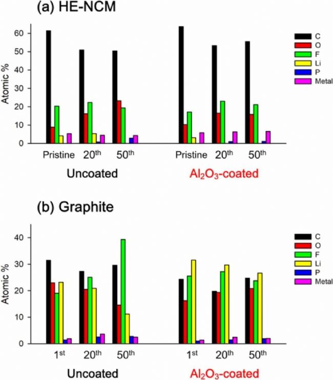 此外,Jurng 等人【8】認(rèn)為 ALD Al2O3 沉積在富鋰 NMC PC 正極上,減少了過渡金屬的溶解和交換,限制了過渡金屬在負(fù)極表面的積累,從而減少了由過渡金屬析出引起的負(fù)極表面電解質(zhì)降解。同時(shí)觀察到石墨負(fù)極的電阻降低,這是由于 PC 正極中過渡金屬的溶解被有效阻止。