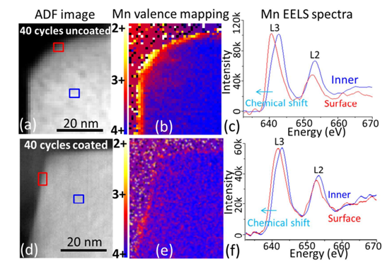 Yan 等人【9】探索了 Al2O3 涂層在連續(xù)流 ALD 反應(yīng)器沉積同一正極材料上的作用機(jī)制。利用先進(jìn)的TEM和電子能量損失譜(STEM-EELS)對 PC 和 UC 正極上的 SEI 進(jìn)行化學(xué)可視化,獲得兩種樣品在 40 次循環(huán)后的 Mn 價(jià)態(tài)分布。