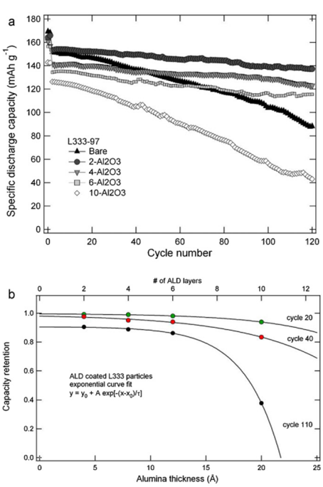 a) ALD 包覆周期數(shù)對電池循環(huán)性能的提升;b) 不同 ALD 厚度對于不同循環(huán)數(shù)的電池容量保持率的影響