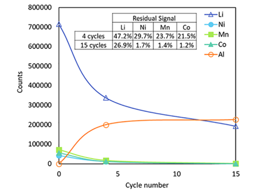 Li、Al、Ni,、Mn和Co 的絕對信號計(jì)數(shù)來自 TOFSIMS。殘余信號百分比(相對于 UC)。這些值清楚地表明 ALD 優(yōu)先沉積氧化鋁在過渡金屬表面的位置。而即便 15 個(gè) cycle 以后,Li 的信號仍然很明顯。
