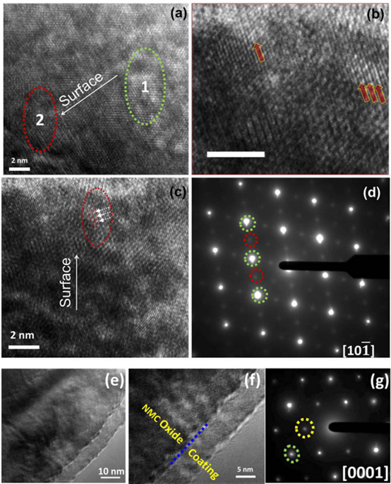 高分辨率透射電子顯微鏡圖像顯示:(a–c) UC NMC顆粒,(e,f) PC Al2O3 包覆的 NMC 顆粒,這些顆粒分別來自經(jīng)過530、760 和 290 次充放電循環(huán)的 2Ah軟包電池;以及來自 (d) 未涂層的 NMC,(g) Al2O3涂層的 NMC 的選區(qū)衍射(SAED)模式圖