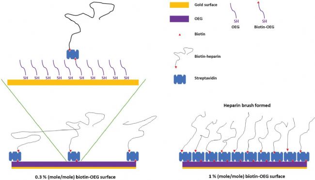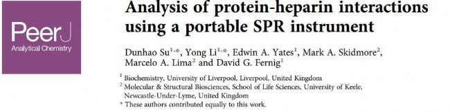 利物浦大學(xué)和基爾大學(xué)的研究團(tuán)隊(duì)在最新發(fā)表的研究中,基于Affinité 的標(biāo)準(zhǔn)金膜涂層芯片,開發(fā)了一種新的傳感器表面修飾方法,并成功應(yīng)用于Affinité SPR儀,檢測(cè)肝素小分子與蛋白間相互作用。這樣的傳感器表面可以批量制備、保存,進(jìn)一步拓展了Affinité SPR儀器的應(yīng)用。