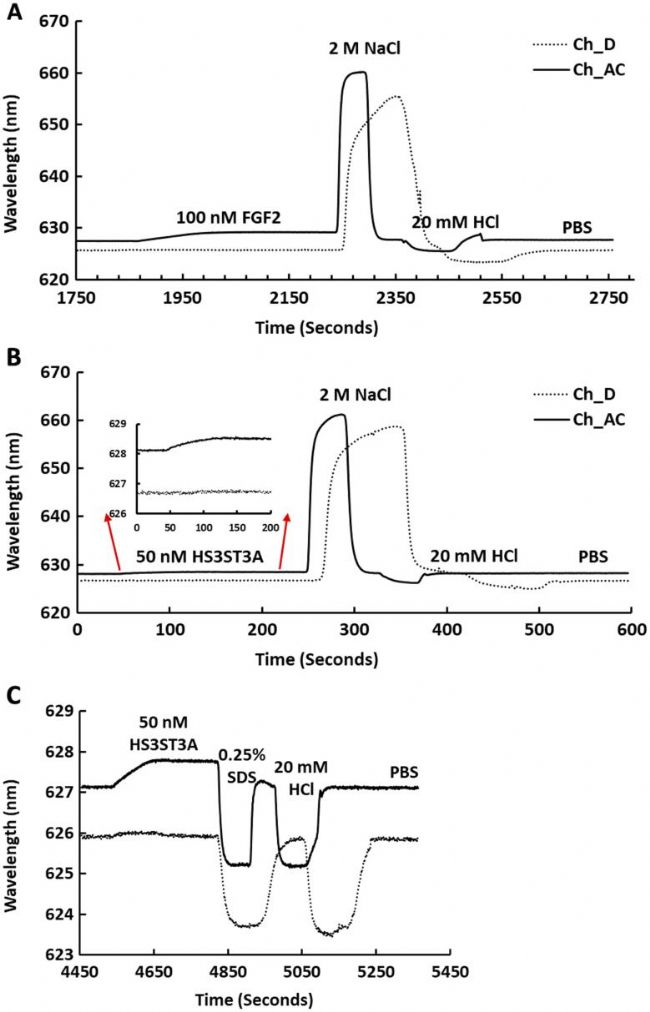 研究團(tuán)隊(duì)通過Affinité SPR儀器成功檢測(cè)了成纖維細(xì)胞生長(zhǎng)因子2(FGF2)與肝素的結(jié)合。這一實(shí)驗(yàn)驗(yàn)證了新型傳感器表面的有效性和穩(wěn)定性。
