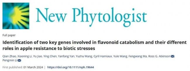 原文:Zhao, Q., Li, X., Jiao, Y., et al. Identification of two key genes involved in flavonoid catabolism and their different roles in apple resistance to biotic stresses[J]. New Phytologist, 2024, 242: 1238-1256.