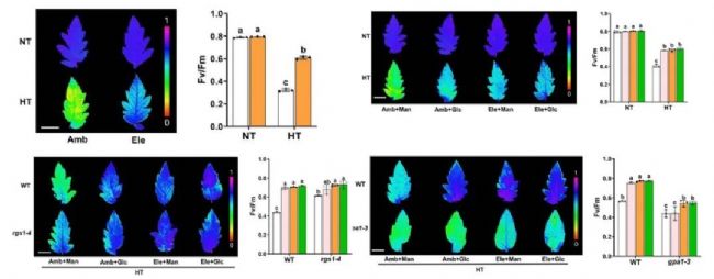 全球氣候變化的兩個(gè)關(guān)鍵因素是二氧化碳(CO2)濃度升高和溫度上升。植物是地球生態(tài)系統(tǒng)的基礎(chǔ),它們對(duì)上述兩個(gè)關(guān)鍵因素的響應(yīng)和適應(yīng)能力直接關(guān)系到地球生態(tài)平衡和人類生存。浙江大學(xué)農(nóng)業(yè)與生物技術(shù)學(xué)院師愷教授課題組前期發(fā)現(xiàn)CO2濃度升高可以在一定程度上減輕高溫對(duì)植物的脅迫效應(yīng),增強(qiáng)植物的抗逆能力,然而其潛在的分子機(jī)制尚不清楚。2024年3月6日,該課題組的最新研究成果在植物生物學(xué)領(lǐng)域知名期刊Plant Physiology上以Glucose-G protein signaling plays a crucial role in tomato resilience to high temperature and elevated CO2為題正式發(fā)表。該研究揭示了揭示了環(huán)境CO2濃度升高,誘發(fā)植物葡萄糖 (Glc)-RGS1 (Regulator of G protein signaling 1)-GPA1 (G protein α subunit) 信號(hào)激活,進(jìn)一步通過(guò)光合作用和光保護(hù)途徑調(diào)控番茄高溫抗性的分子機(jī)制。本研究中番茄葉片葉綠素?zé)晒鈪?shù)Fv/Fm的測(cè)量通過(guò)MAXI-IMAGING-PAM葉綠素?zé)晒獬上裣到y(tǒng)完成。光系統(tǒng)I光能轉(zhuǎn)換活性通過(guò)雙通道葉綠素?zé)晒鈨xDUAL-PAM-100完成。